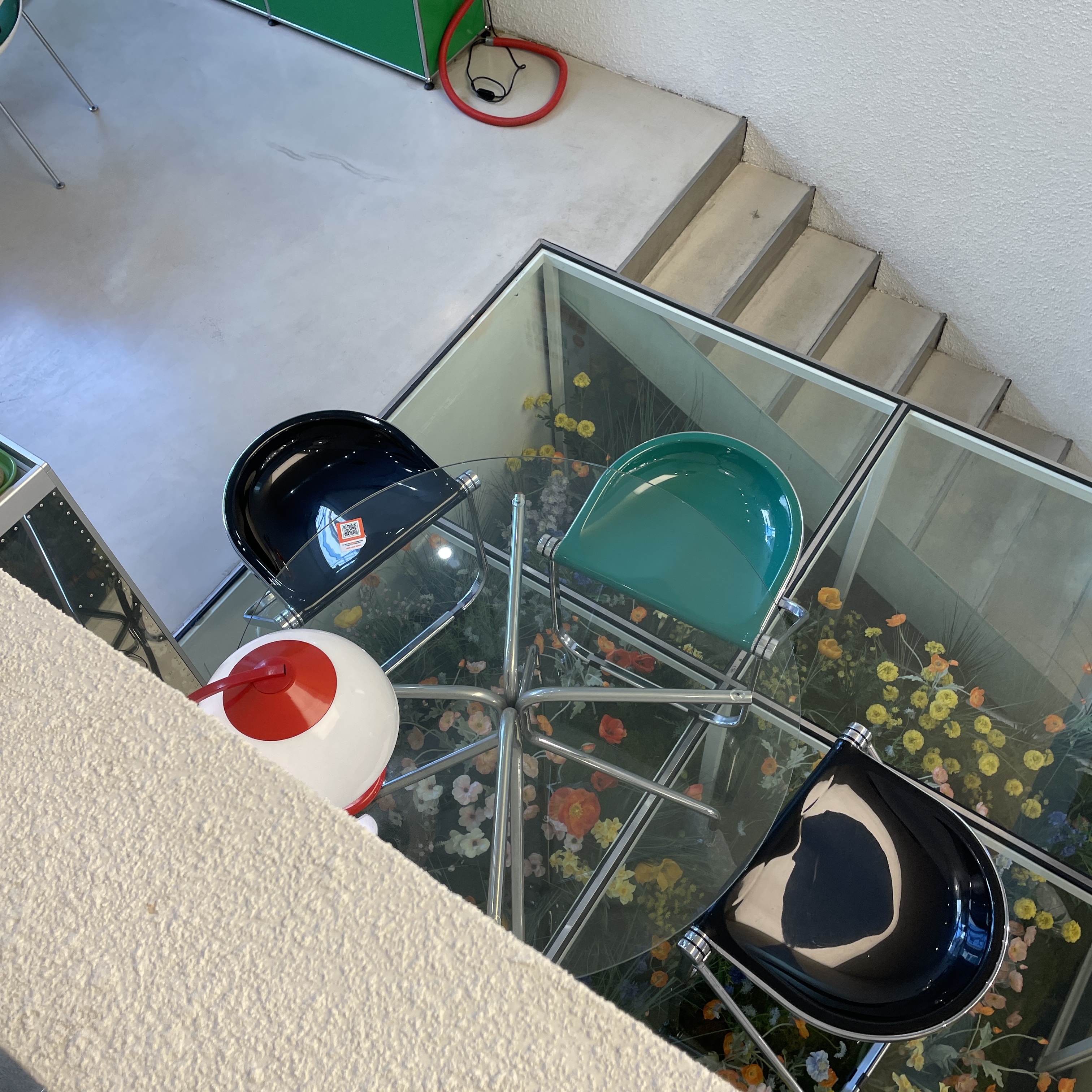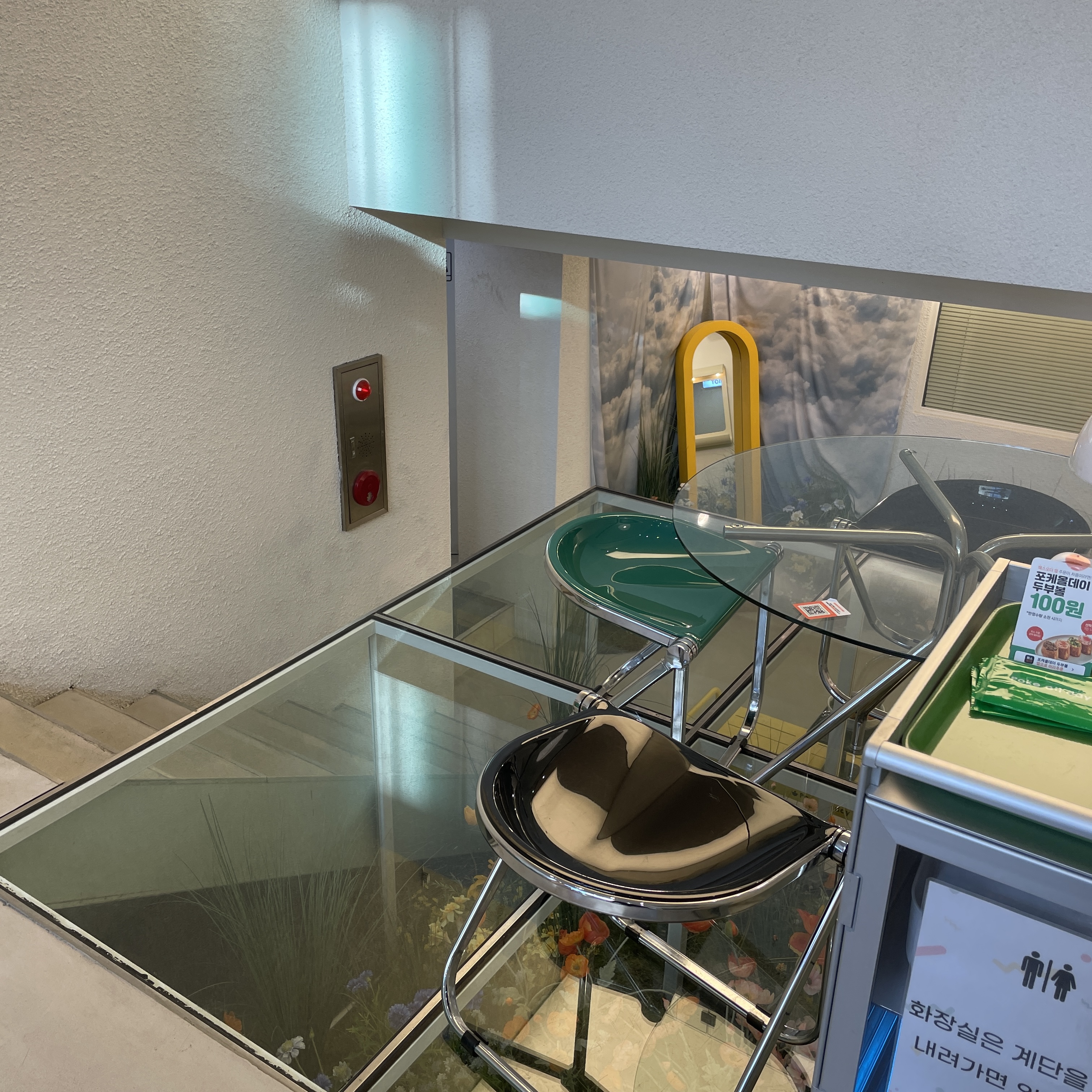 지하로 가는 계단 옆에 이렇게 투명 발판 위에 놓인 테이블