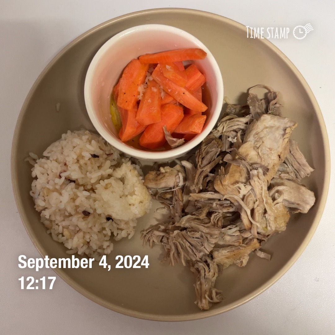 밥 150g, 뒷다리살 157g, 당근(올리브오일 드레싱)