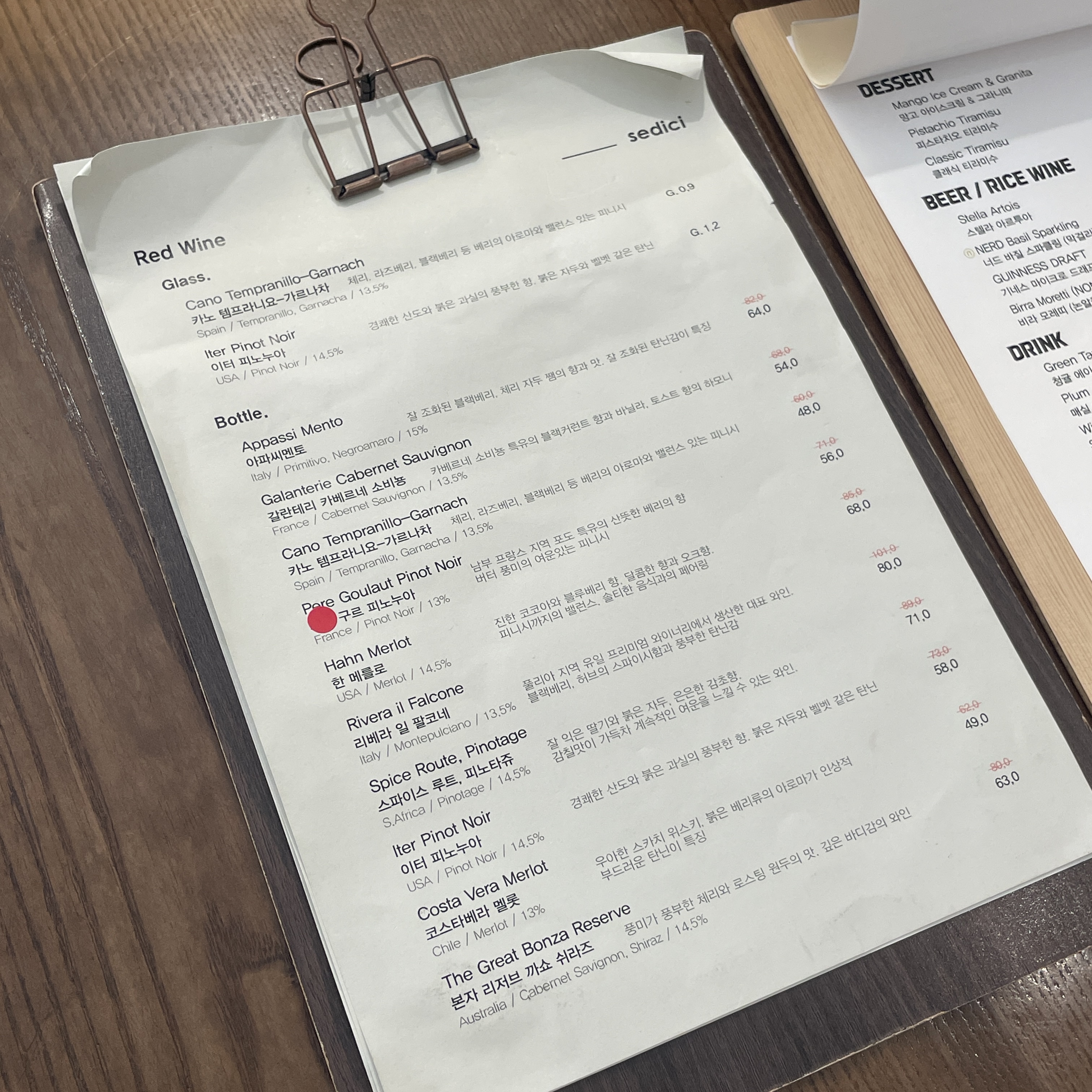 음식메뉴와 와인 메뉴판이 따로!