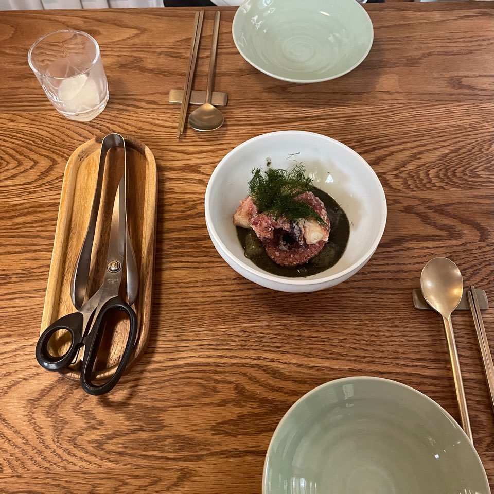 위에 올려진 감태와 잘 튀겨진 문어튀김 그리고 쫜득한 감자 옹심이랑 김퓨레가 잘 어우러진다.
