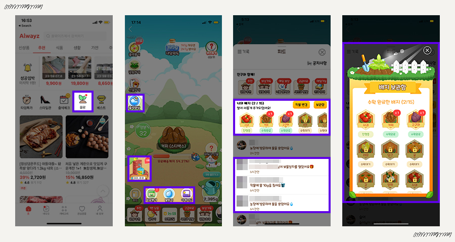 농작물, 커피 등을 얻을 수 있다! 예전에 한창 ㅇㅇ팜 게임 같은 게 유행했던 것 같은데 이건 게임도 하면서 가상으로 내가 키운 식물을 실제로 받을 수 있다는 즐거움이!! 물론 시간은 굉장히 오래 걸린다.. 친구가 많다면 빨리 받을 수 있을지도!!