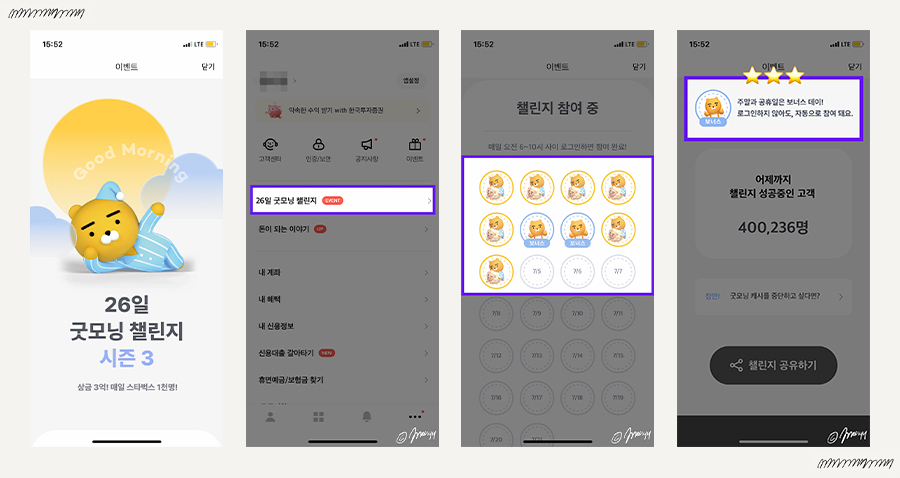 그리고 세이프 박스의 이자를 받아야 하기 때문에 어차피 1일 1카뱅 접속이 필요하니 26일 굿모닝 챌린지도 함께 해보는 것을 추천한다!